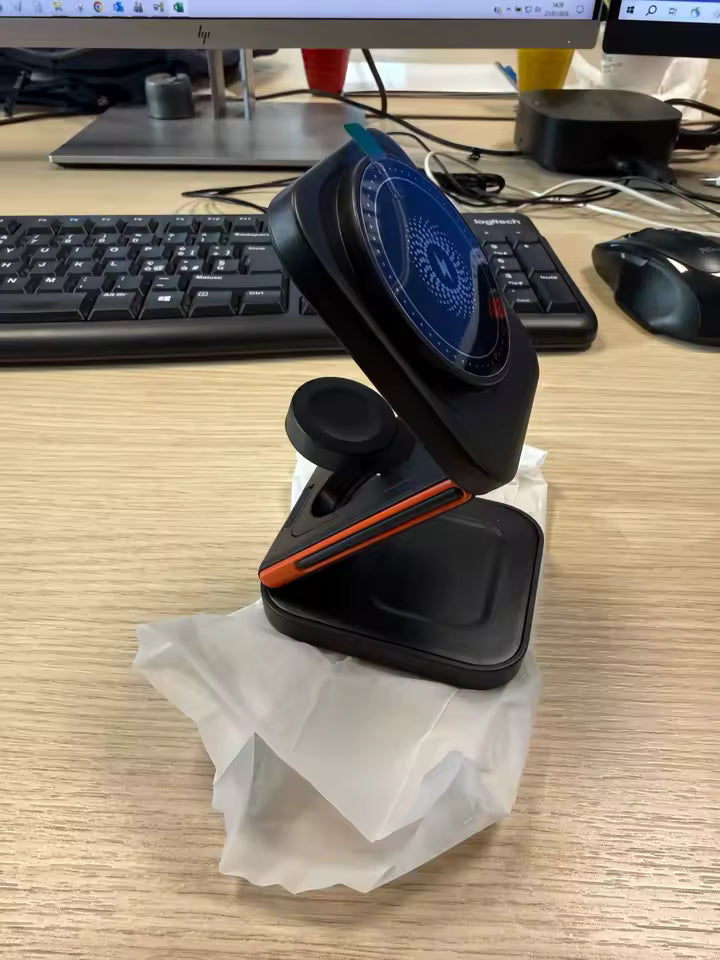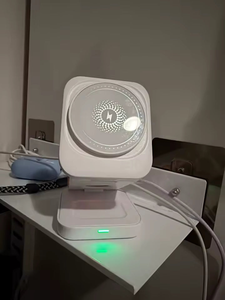 Bringen Sie Ordnung und Stil auf Ihren Schreibtisch mit unserer faltbaren Ladestation aus Aluminium, speziell für Ihr Apple-System entwickelt.