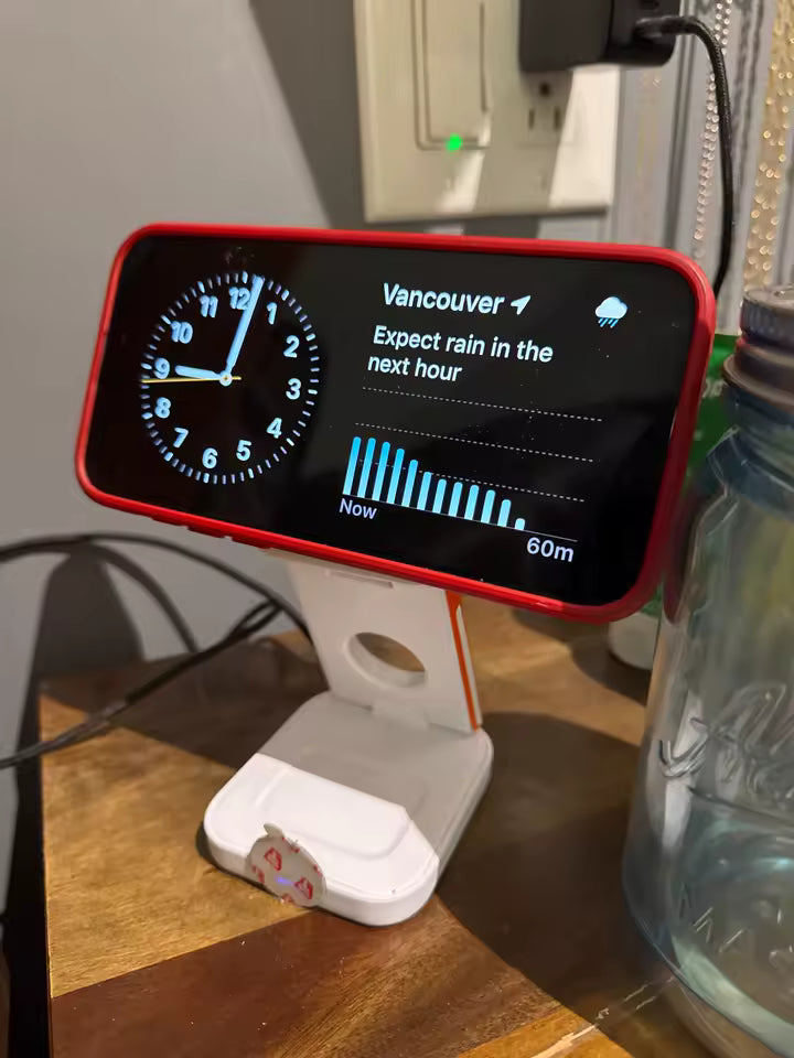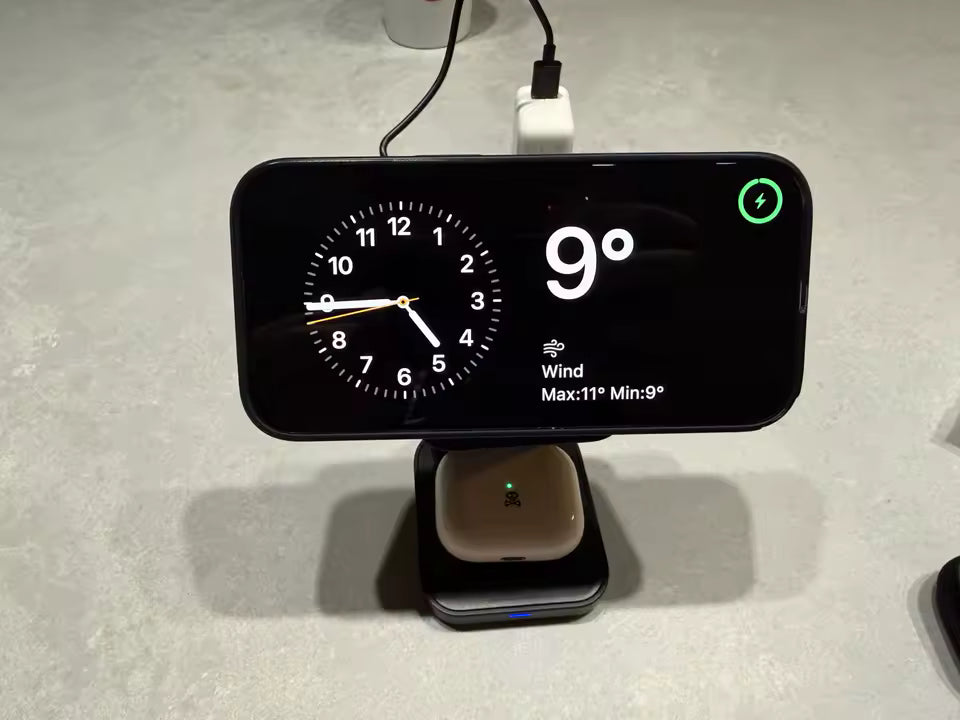 Die Station ist eine universelle All-in-One Lösung, mit der Sie Ihr Smartphone, Ihre Smartwatch und Ihre kabellosen Kopfhörer (z. B. AirPods) gleichzeitig an einem zentralen Ort laden können.